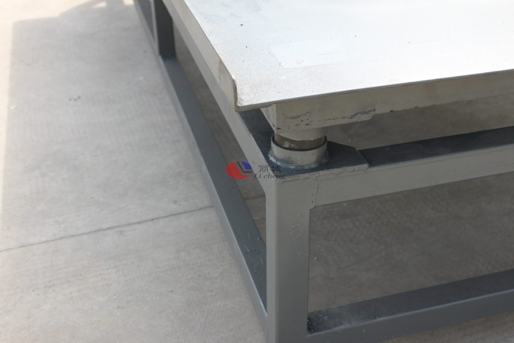 對于尺寸規(guī)格較大的水泥制品模具,在澆筑過程中不方便將模具內(nèi)的空氣,以及混凝土在模具中的均勻攤平,通過使用振動臺來將內(nèi)部空氣排放和混凝土的振實(shí)。振動臺四個(gè)臺腳處都設(shè)計(jì)上了墊腳,在震動過程中能保持平衡。