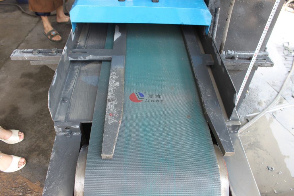 制作這臺多功能成型機的技術員在對這臺機器出廠前進行了最后一步的調試,將澆筑成型的水泥磚放置輸送帶上,成型機入口處與出口處都有配置供水系統,防止在制作過程中塵土飛揚,能對水泥制品打磨過程中其表面更為整潔統一。經過平磨系統對水泥模具澆筑成型的水泥制品進行磨形,后進入第二系統對水泥磚塊制品就進行拉條紋,這款多功能側石二工位條紋成型機打磨成型的條紋彩磚的外觀以34條紋為主。打磨成型后在有輸送帶將水泥磚運輸出來。其使用過程中為防止施工過程中的安全事故的發生,通過使用電控箱的方式來對機器進行急停控制。