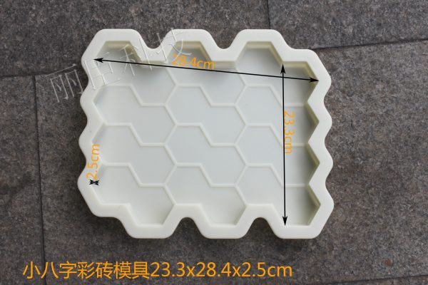 這款小八字彩磚塑料模具外觀上呈現出不規則形狀,遠處看過去外觀有些像蜂巢的樣式,彩磚模具的規格為28.4×23.3×2.5,彩磚塑料模盒在制作過程中采用全新的ABS為主要生產原料,至成型后的彩磚塑料模具外觀整體呈現一種淡鵝黃色,其模具表面能有明顯的光澤感,下面這張圖是小八字彩磚模具澆筑成型后的模型款式。
