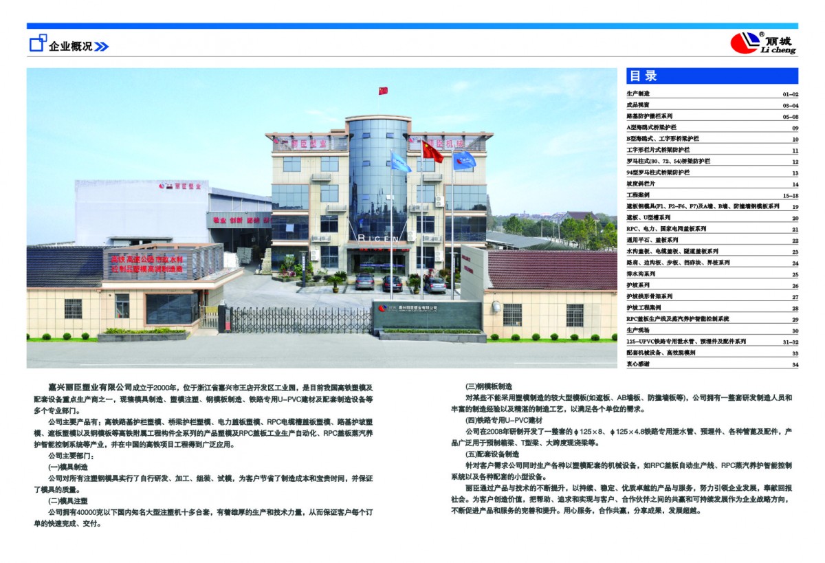 15-18頁:工程案例 ? ? ? ? ? ? ? ? ? ? ? ? ? ? ? ? ? ? ? ? ? ? ? ? ? ? ? ? ? ? ? ? ?19-20頁:水泥遮板塑料模具、水泥遮板鋼模具、電纜槽模具系列